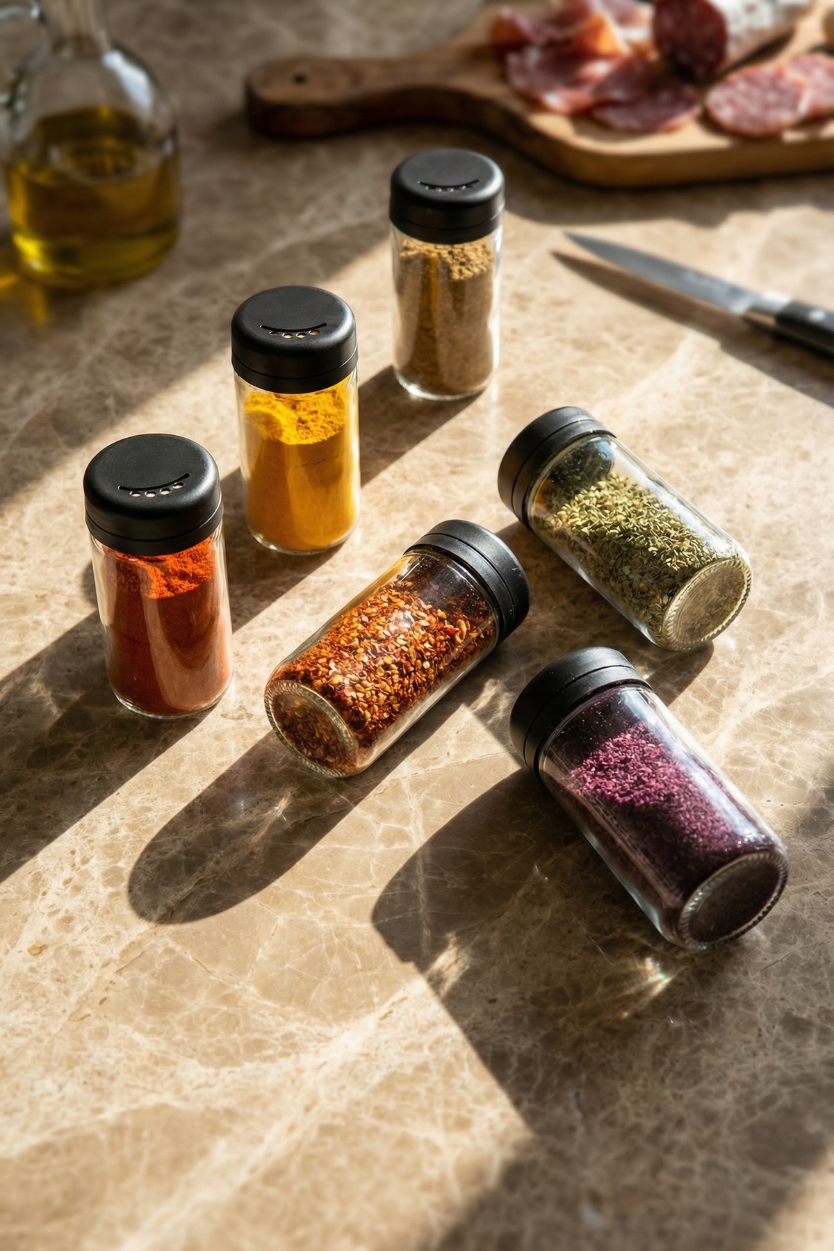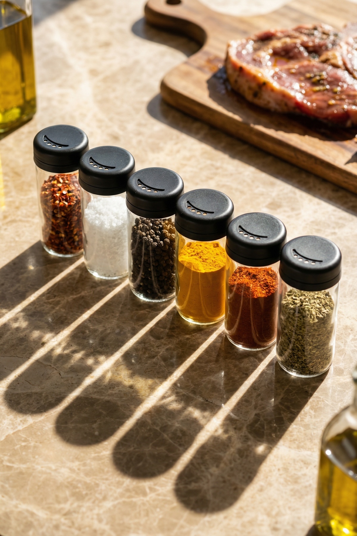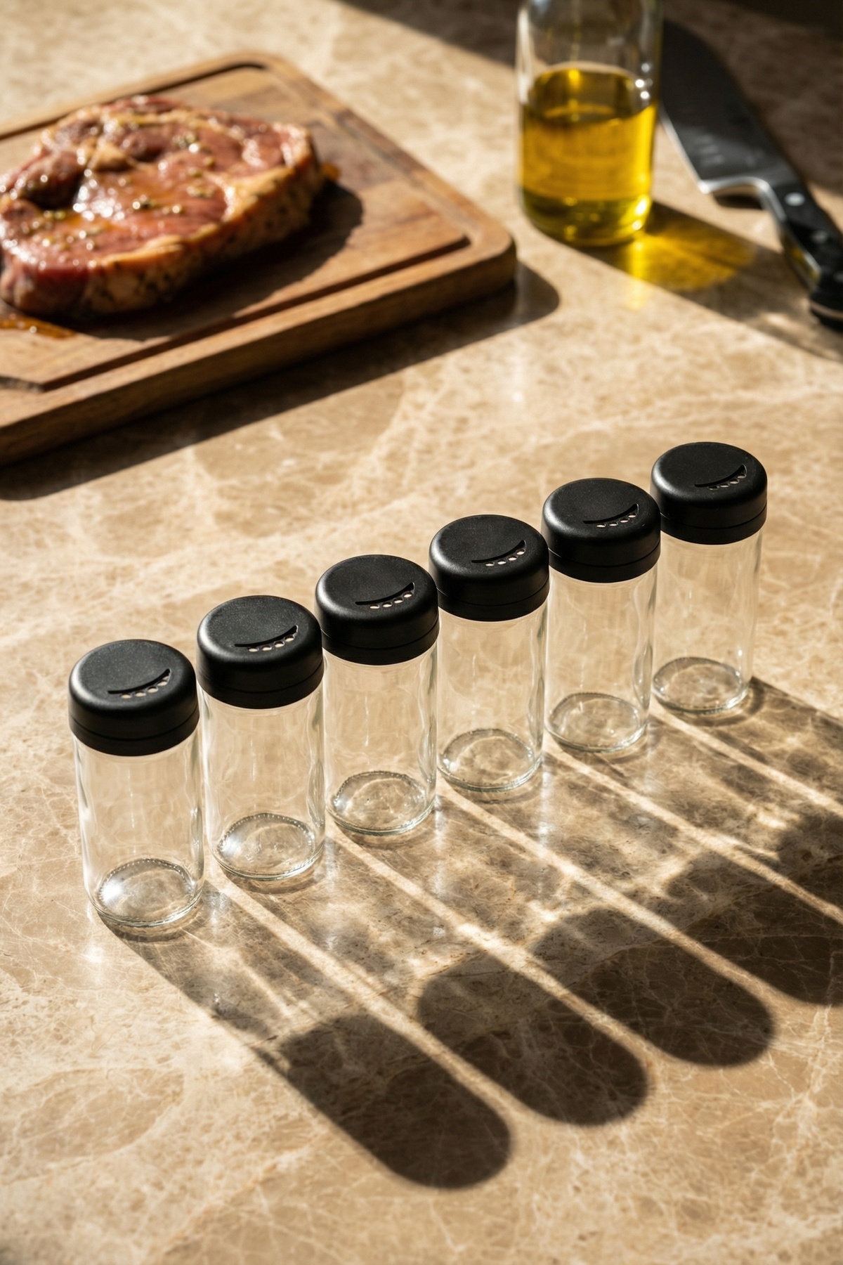 Tuz, karabiber, pul biber, kekik ve diğer tüm baharat çeşitleri için ideal olan bu cam baharatlık seti, günlük kullanımda pratiklik sağlarken mutfağınıza modern bir dokunuş katar.