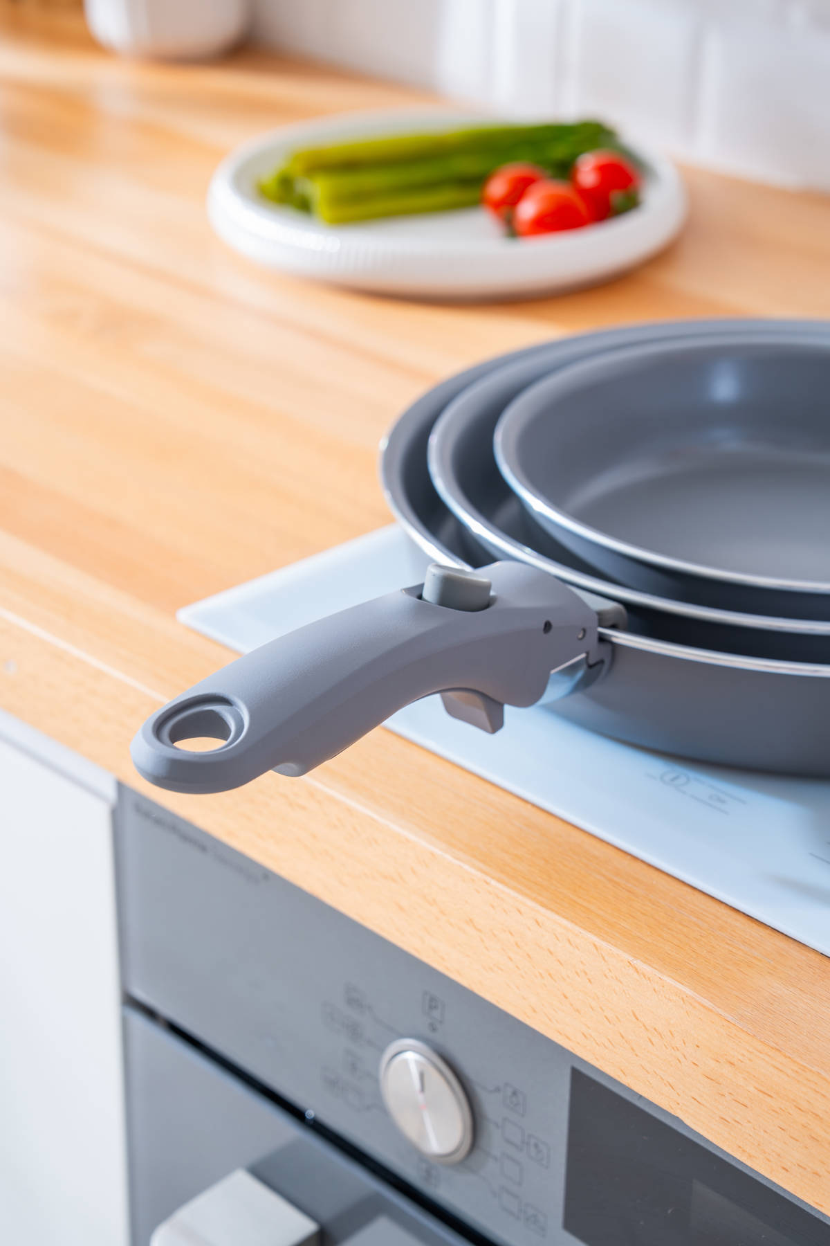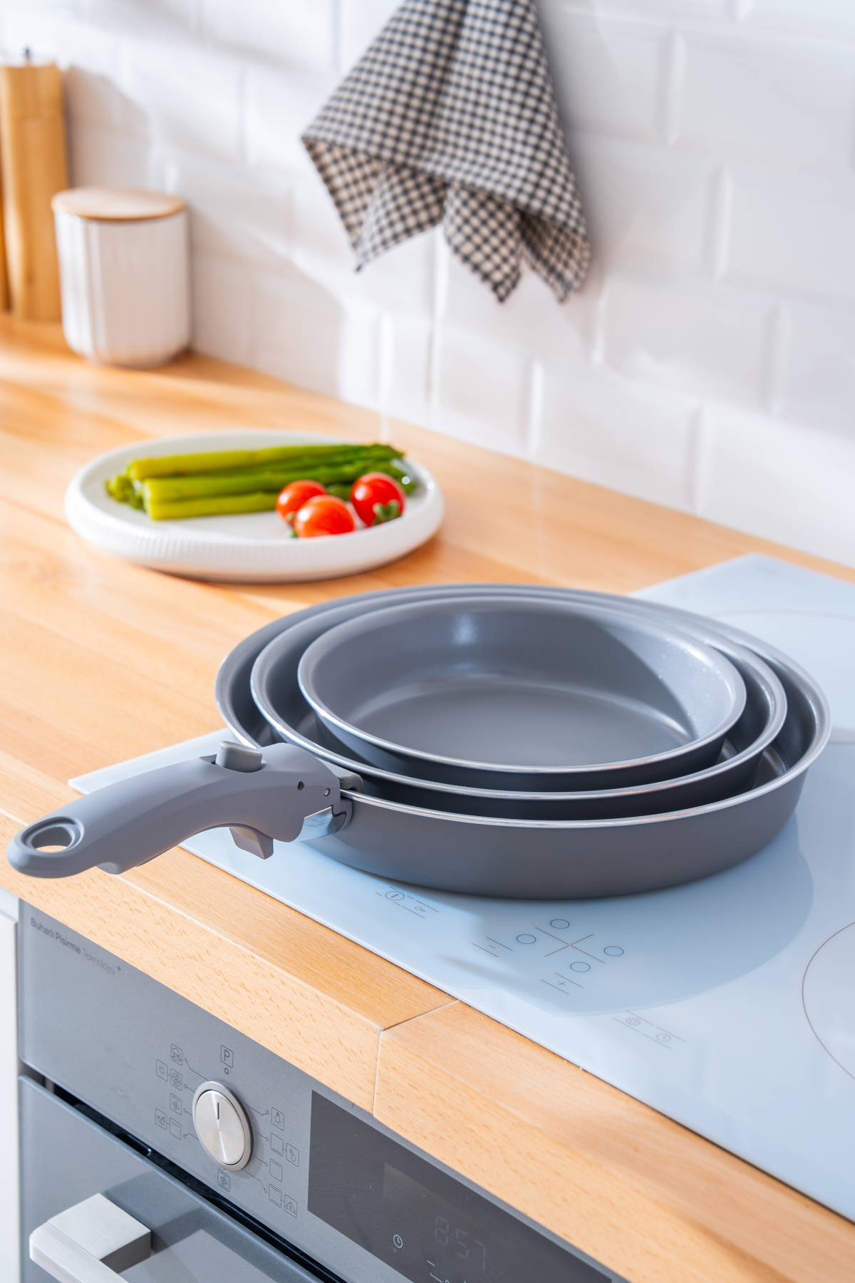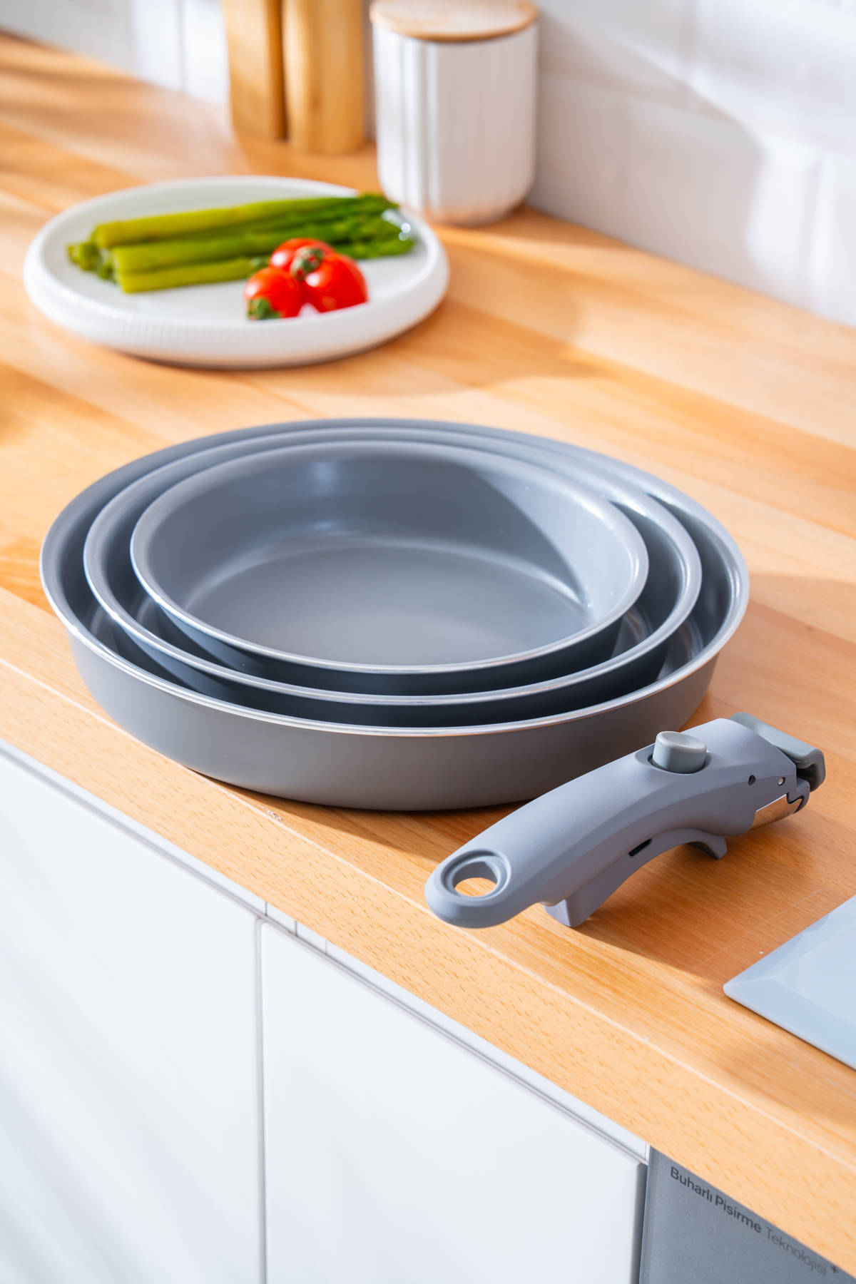 Farklı ölçülerdeki üç tava, çıkarılabilir yumuşak dokulu kulp sayesinde hem ocakta hem fırında kullanım kolaylığı sunar. Alan tasarrufu sağlayan yapısıyla üst üste saklanabilir, modern mutfaklar için ideal bir çözüm sunar.