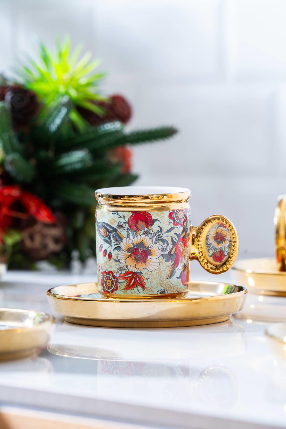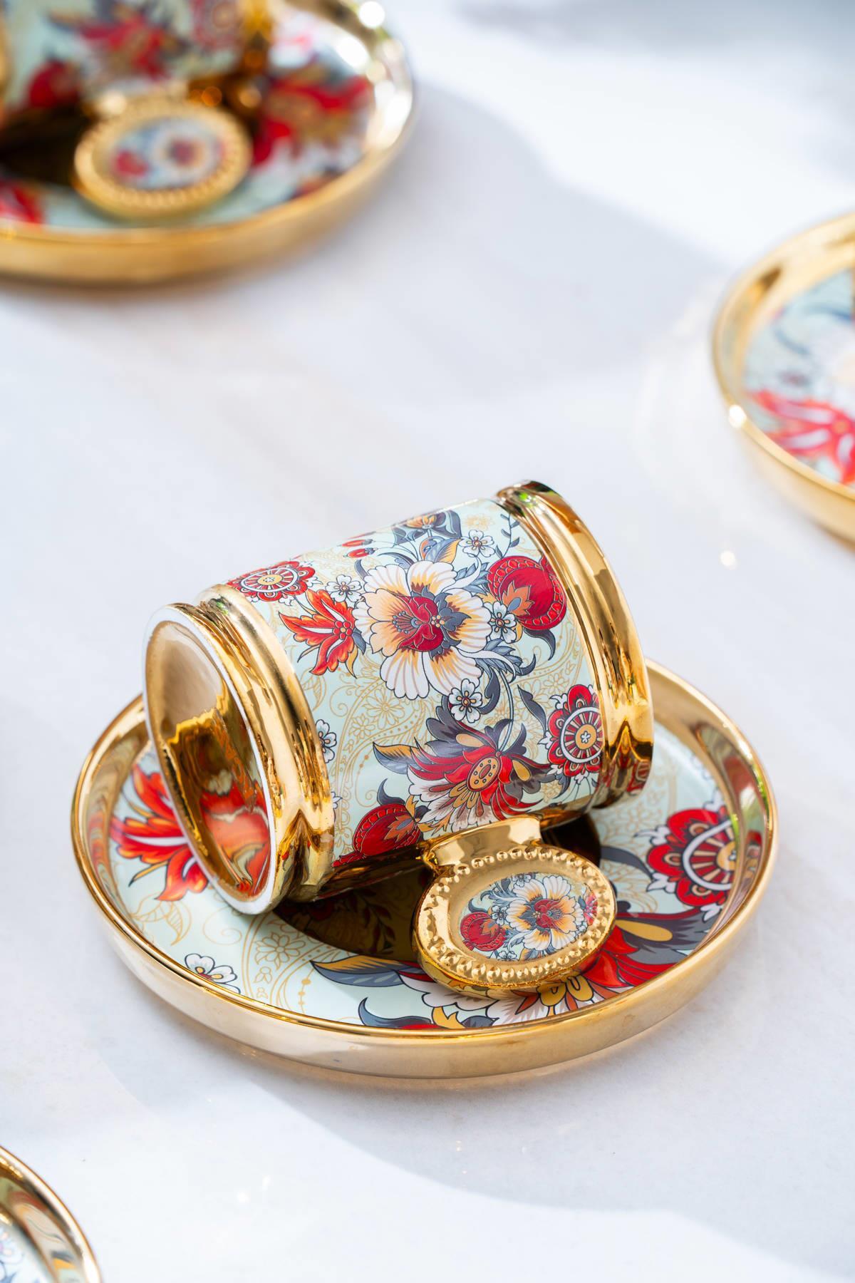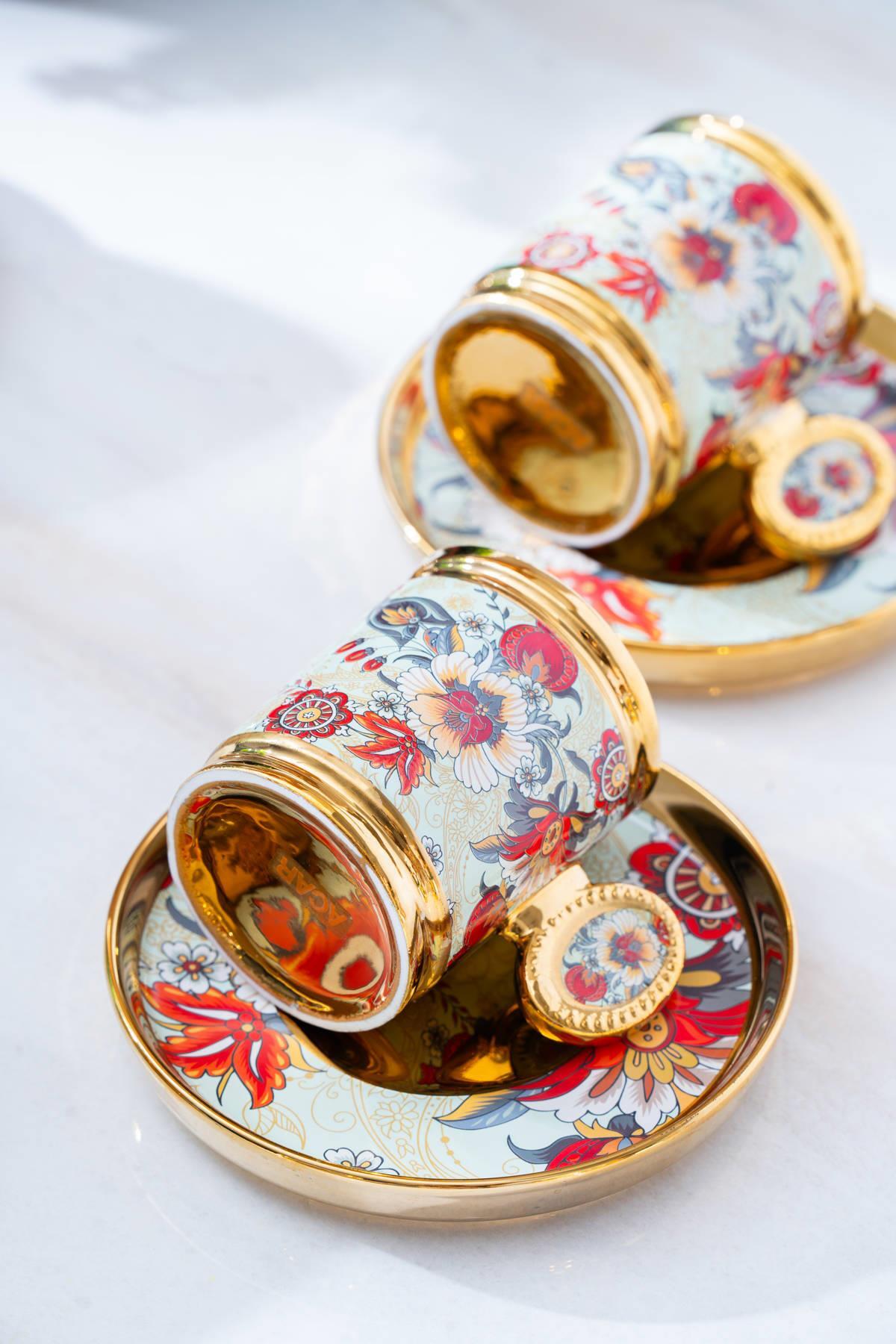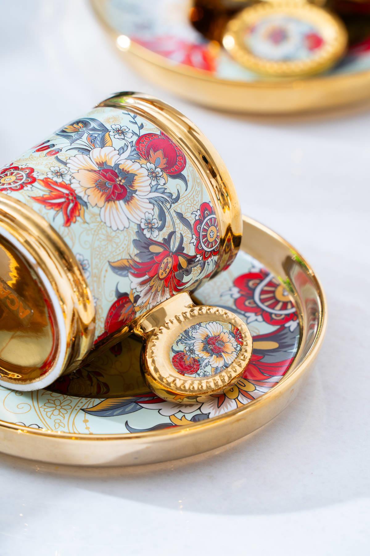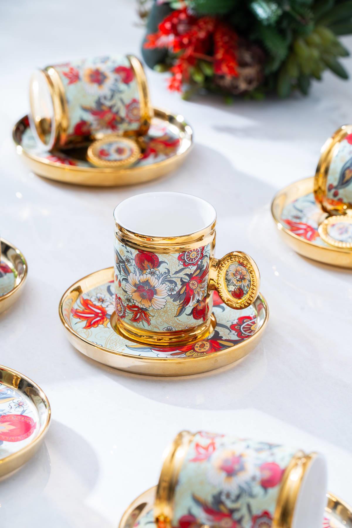 Acar Home’un çiçek desenli, gold detaylı 6 kişilik kahve fincan takımı; geleneksel misafirperverliğe modern bir dokunuş katıyor. Fincan ve tabakların çevresini saran altın ışıltılar, her sunuma zarafet ve şıklık katarken, romantik desenler sofraya sıcak bir ruh kazandırıyor.